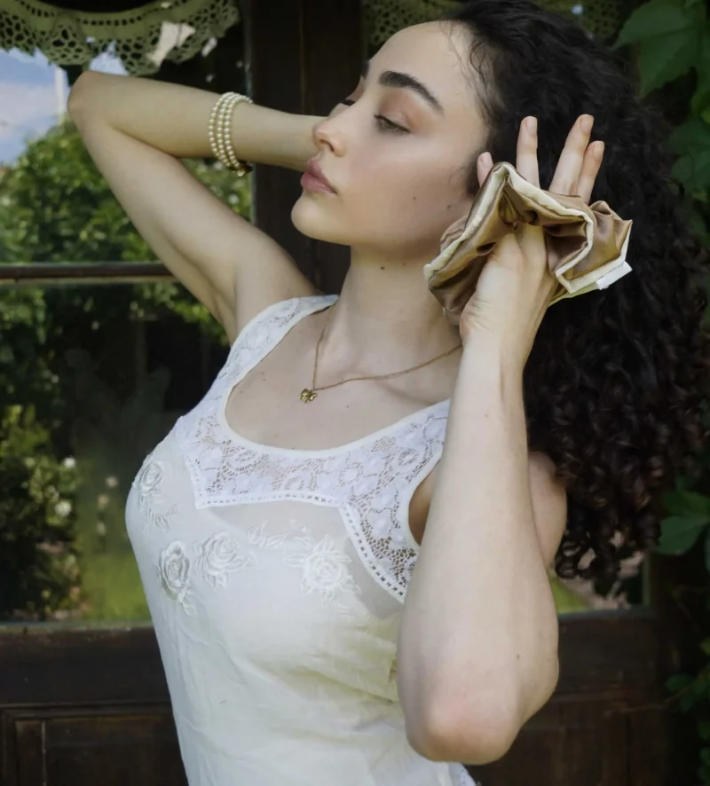 Scrunchies de satén con detalle broderie color crema. Gracias a su tela suave y delicada, son una opción ideal para tu cabello. A diferencia de otros elásticos que pueden perjudicarlo, estos scrunchies mantienen tu peinado sin dañarlo, evitando el frizz y la rotura. Lavalo a mano semanalmente para mantener su suavidad y funcionalidad.
